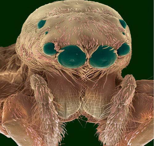 Micrografía electrónica de barrido en color de la cabeza de una araña saltadora (familia Salticidae)