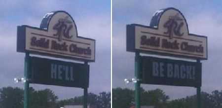 Como muestra de buen humor del pastor de la congregación, al siguiente día el anuncio de la iglesia mostraba el texto “He’ll be back”.