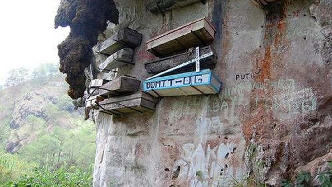 Los habitantes de la Isla Luzón, en las Filipinas han estado enterrando a sus muertos junto a los Acantilados de Sagada por más de 2000, y ahora cientos de ataúdes pueden ser vistos colgando en lo alto de las montañas.
