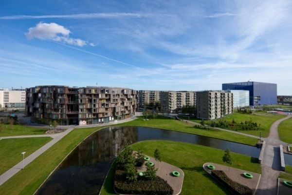 El terreno se ubica cerca de la Universidad de Copenhague en Orestad North, un vecindario de reciente planeación caracterizado por los continuos canales y una estructura consistente de edificios rígidos.